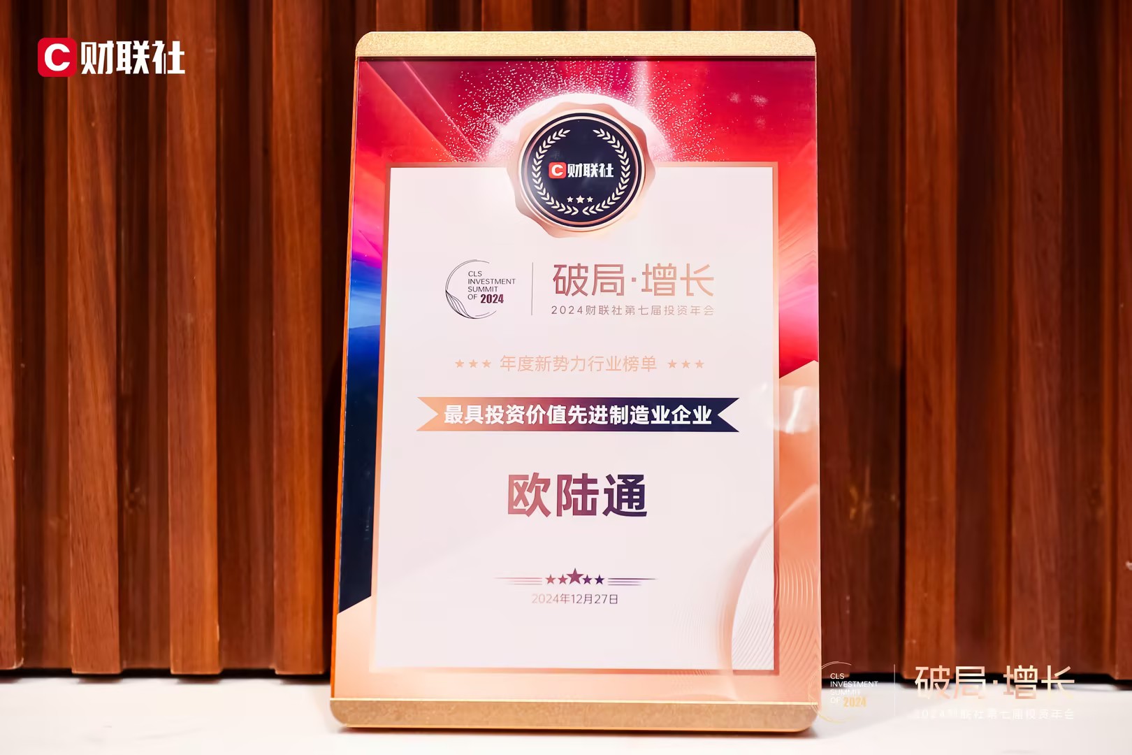12月27日,2024財(cái)聯(lián)社第七屆投資年會(huì)在上海舉辦,邀請(qǐng)各界嘉賓解讀政策紅利,探討新舊動(dòng)能轉(zhuǎn)換中的新機(jī)會(huì),共同尋找經(jīng)濟(jì)發(fā)展新路徑。會(huì)上公布了“2024財(cái)聯(lián)社資本市場(chǎng)最具價(jià)值影響力榜單”,歐陸通獲評(píng)“最具投資價(jià)值先進(jìn)制造業(yè)企業(yè)”稱號(hào)。